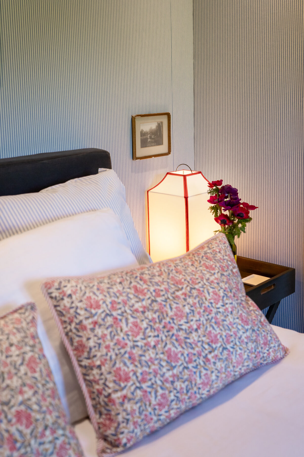 Two fabrics in different Jane Churchill stripes were hung on the walls. The wardrobe was covered in the same fabric. Double blackout curtains in “toile de joy” fabric have replaced the previous curtains.