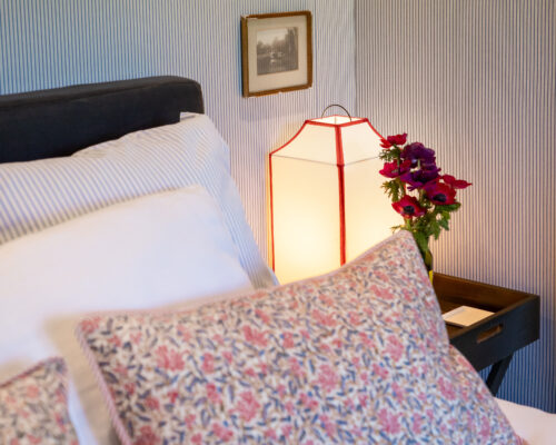 Here you will find two 90cm beds with Louis XVI headboard, Sarah Lavoine reading lamps, 19th century portraits, poufs, bedside drawers, seagrass floor covering. It is comfortable for kids but less for adults as the ceiling is not very high. This said, it may be convenient for an adult guest for one night.