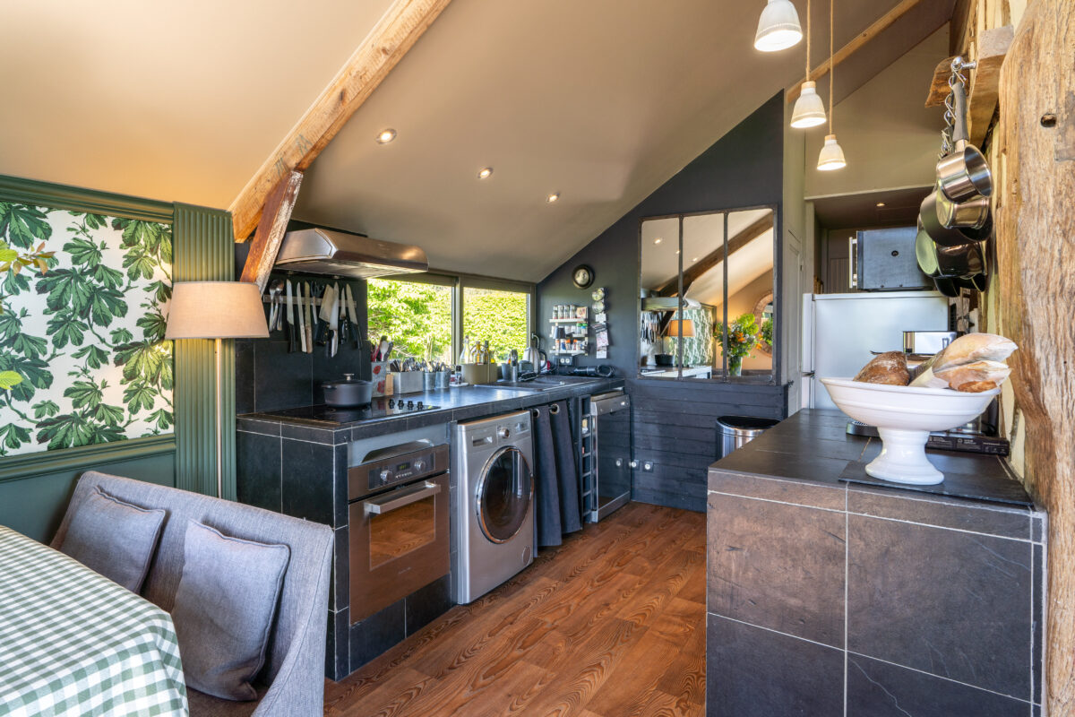Fully equipped with two slate counters, stainless steel appliances (refrigerator, dishwasher, microwave, Owen, washing machine, filter coffee machine, Nespresso machine, toaster, kettle, mixer), the kitchen has all you might need.