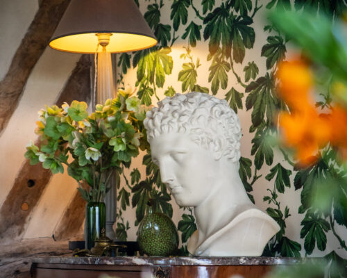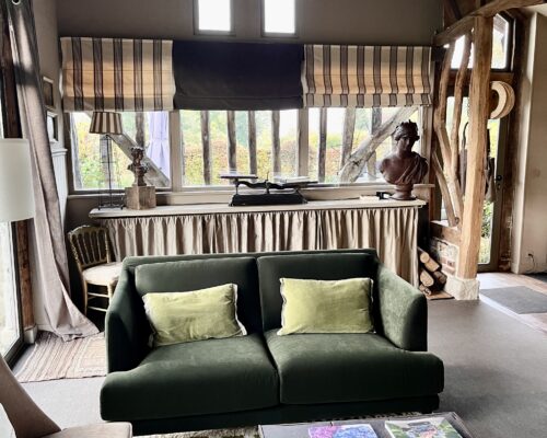 The Dining Room was given a new look in 2025: a new Farrow & Ball green on the wall, and a very beautiful ‘Chestnut Leaves’ stretched fabric by Rose Cumming, distributed by Casa Lopez Fabrics and staged as a large moulded frame, framed by two pilasters. The wall fabric is also used in the living room.