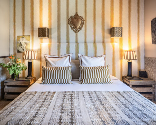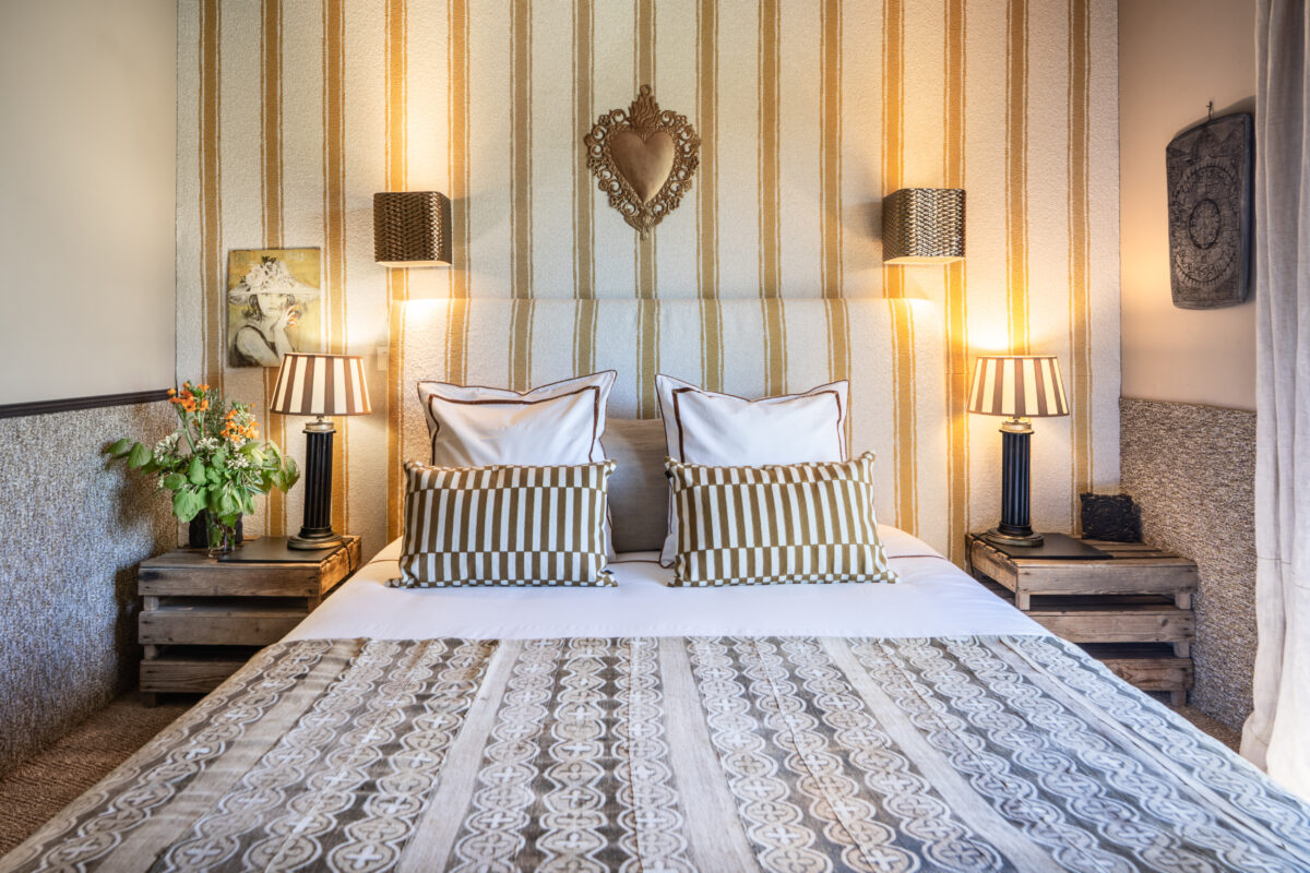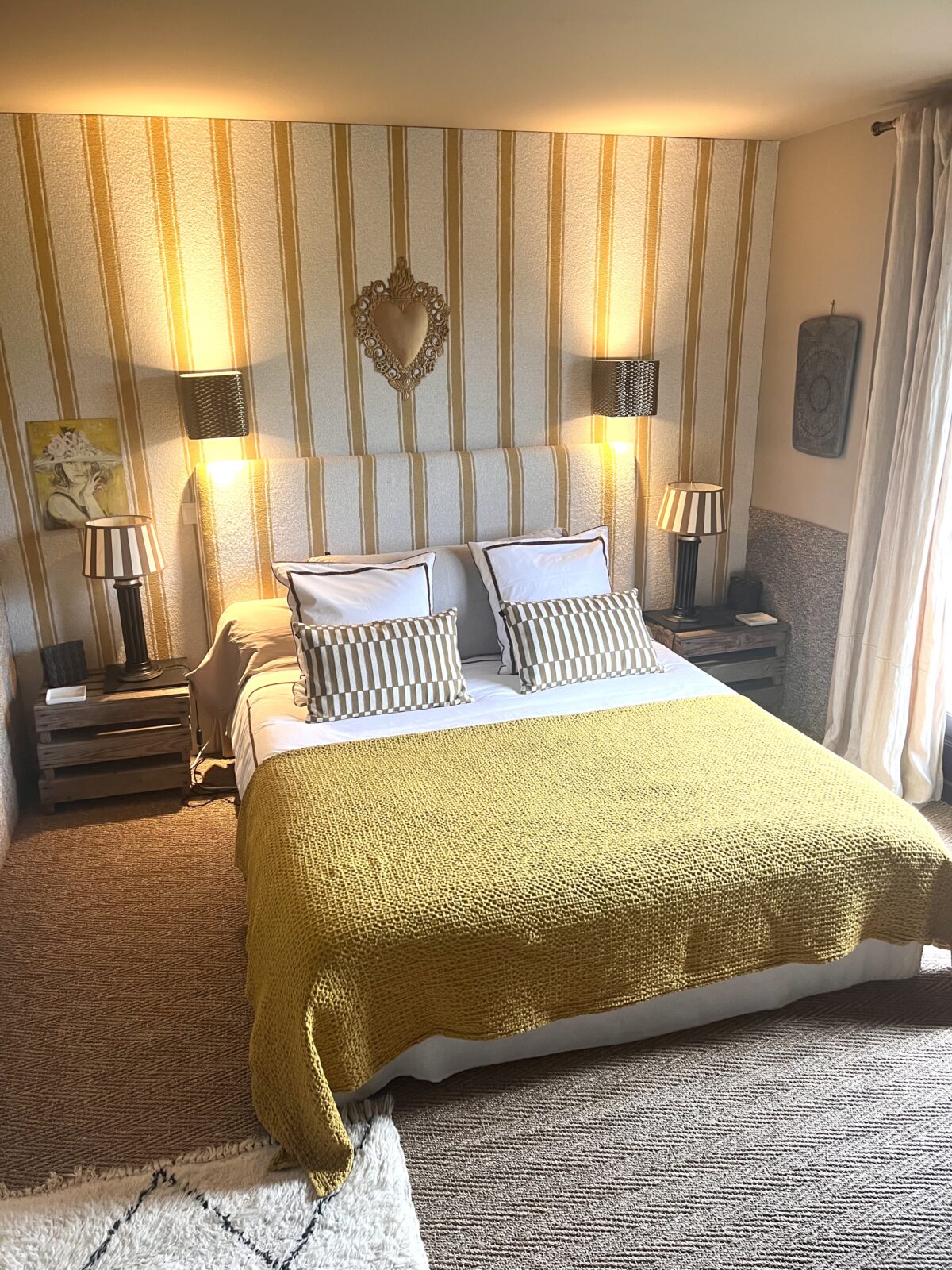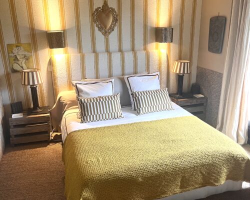 A Nobilis wall fabric with large ecru and yellow stripes was hung on the wall behind the bed, and the headboard was covered in the same fabric, adding warmth to the room. It has quality 160 cm bedding, gilded porcelain wall lights, lamps and bedside tables, a wardrobe, antique Marrakesh prints, a small Louis XVI pouffe and a Napoleon III armchair, lined linen curtains, a Beniouarain rug and sea rush on the floor.