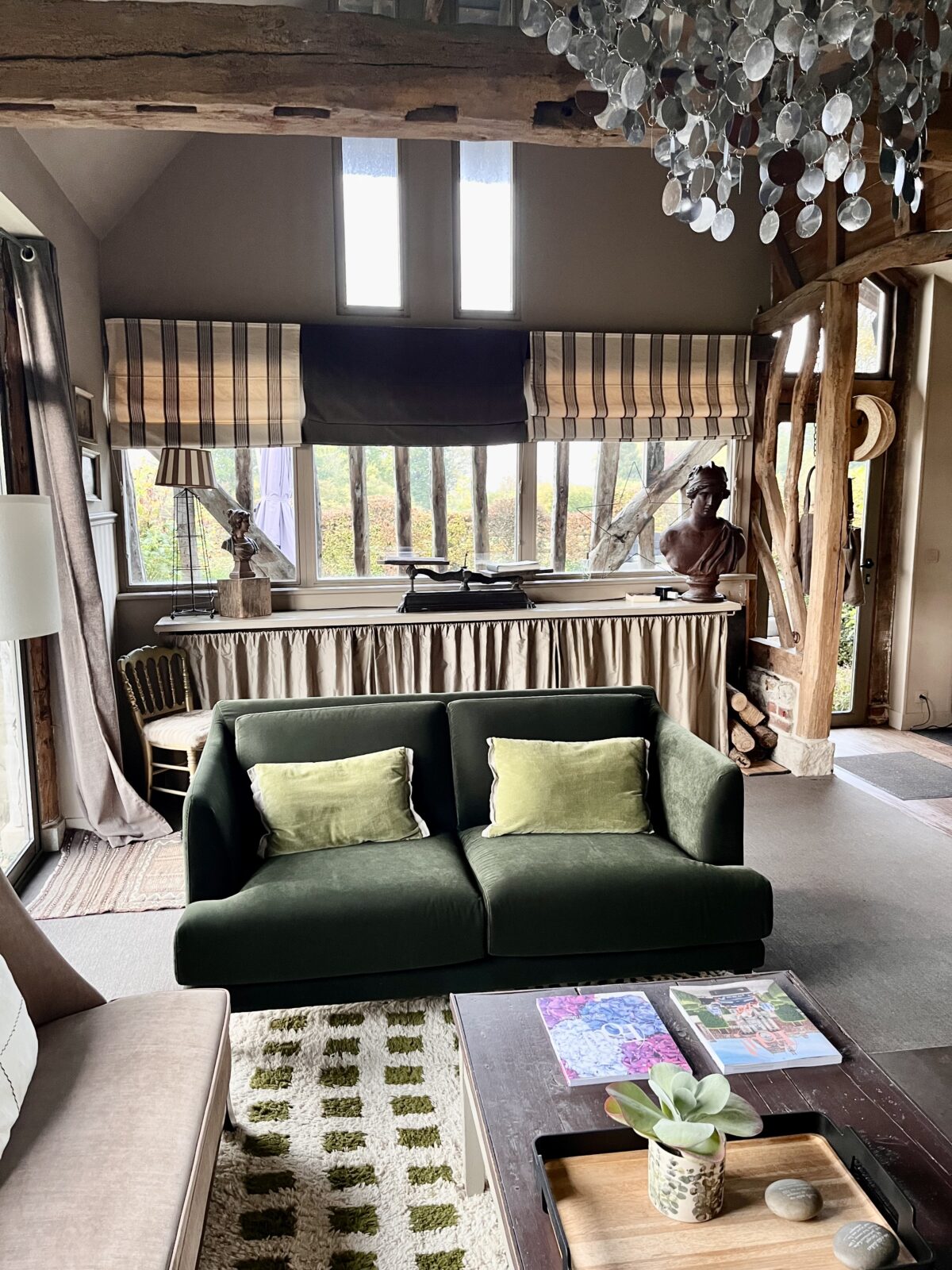 The atmosphere in the living room was revamped in 2025: a new green on the wall around the large mirror, a lovely ‘Chestnut Leaves’ stretched fabric by Rose Cumming, distributed by Casa Lopez Fabrics and displayed like a large moulded frame, and a beautiful 19th century chest of drawers with a marble top.